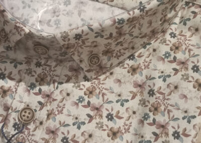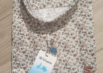 Camisa manga larga de la marca La Vespita con estampado floral en tonos beige, marrones y azules, Hecho en España.