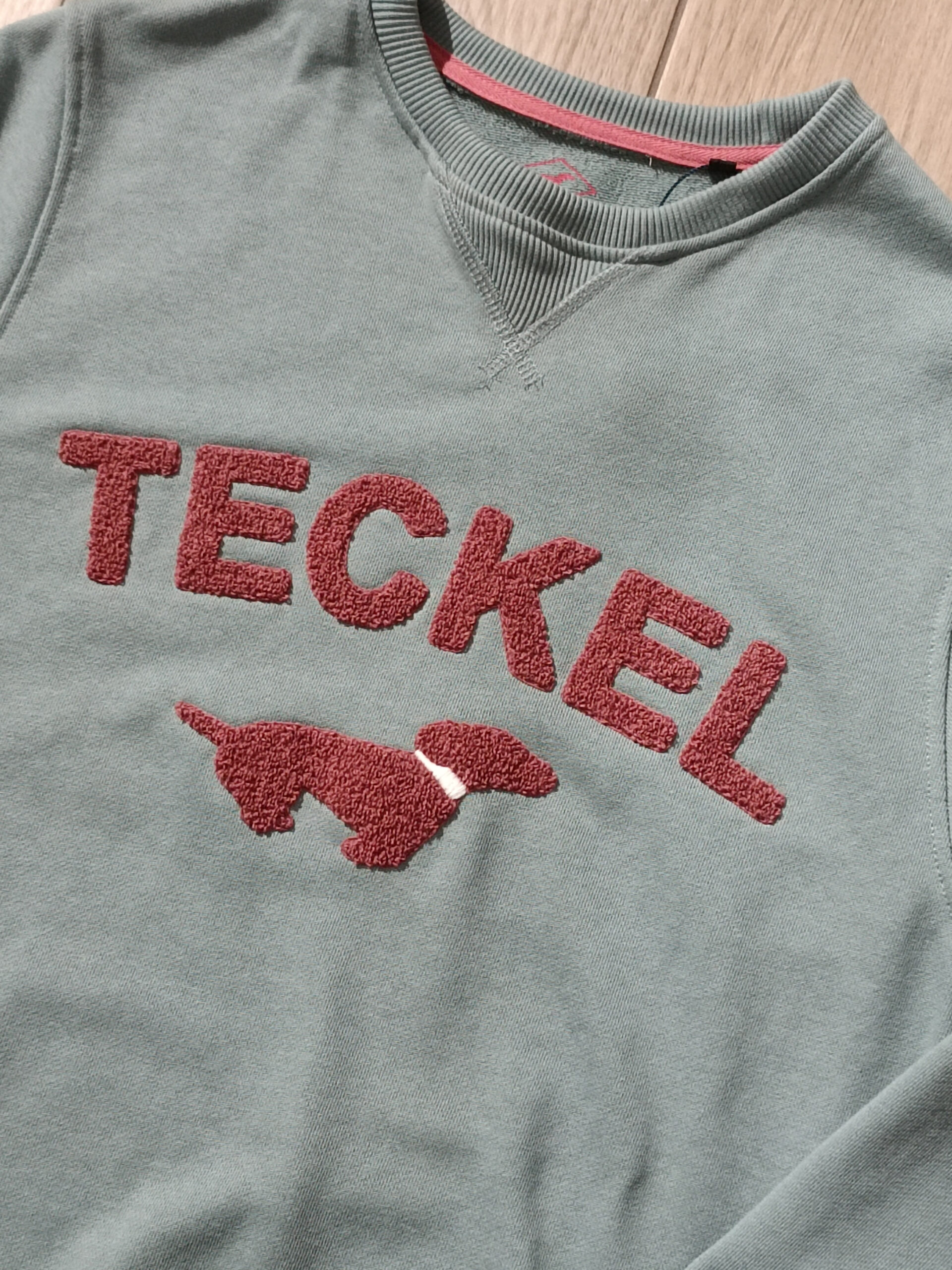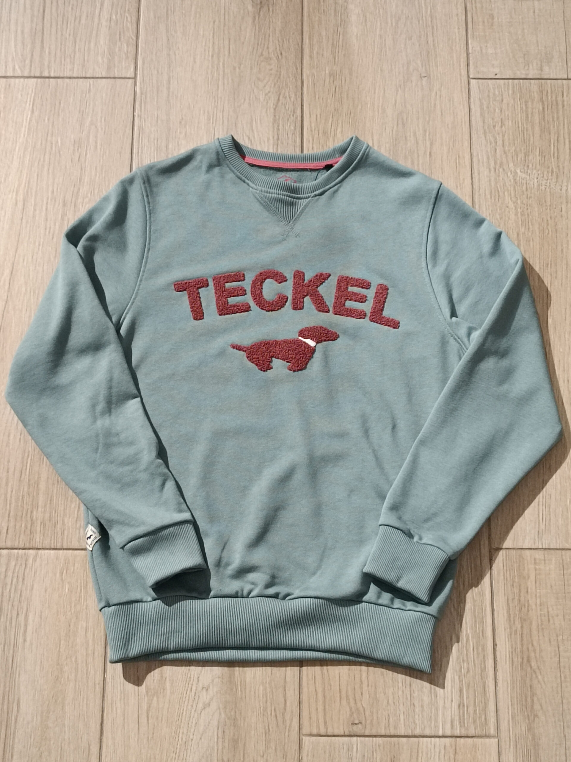 Sudadera Gilbert Teckel en color petroleo con logo de la marca en relieve en color burdeos.
