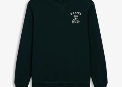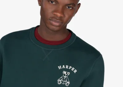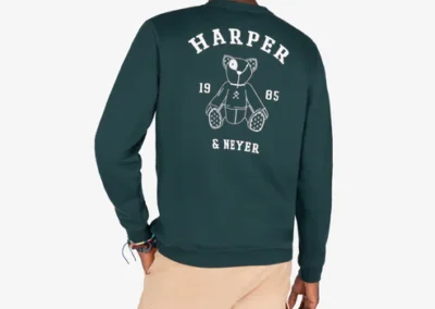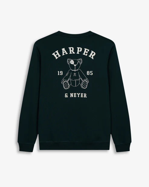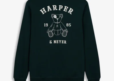Destaca por su bordado frontal minimalista del icónico oso Arthur y una gran ilustración en la espalda acompañada del logotipo “Harper & Neyer 1985”, con estilo universitario.