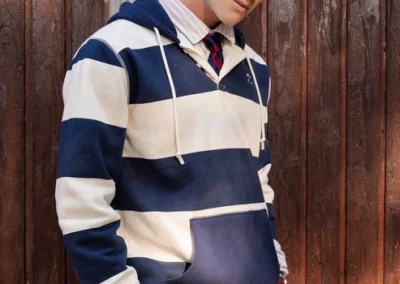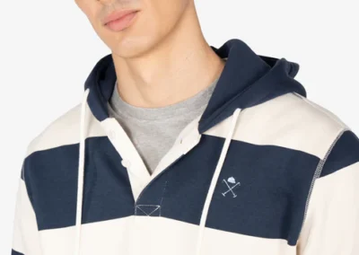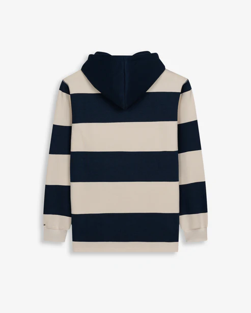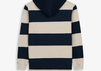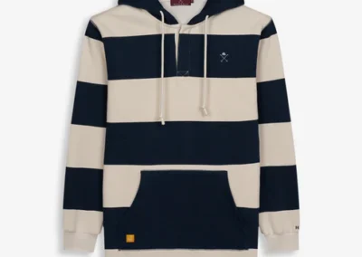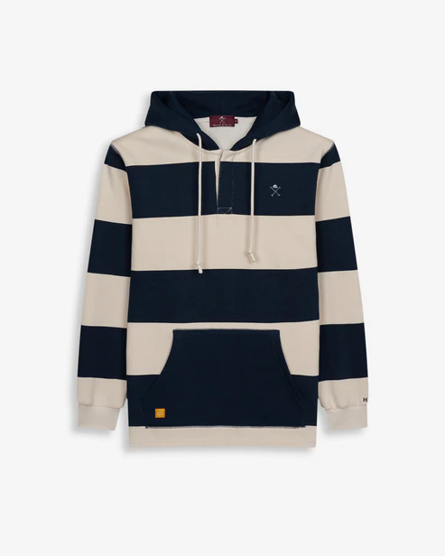 Sudadera de rayas anchas estilo rugby de la marca Harper and Neyer con capucha. Diseño a dos tonos en tejido de algodón de alto gramaje, con bolsillo canguro frontal, puños canalé y logo bordado en el pecho. El fit es cómodo y relajado, con inspiración directa en el espíritu universitario británico del universo Victory Ridge.